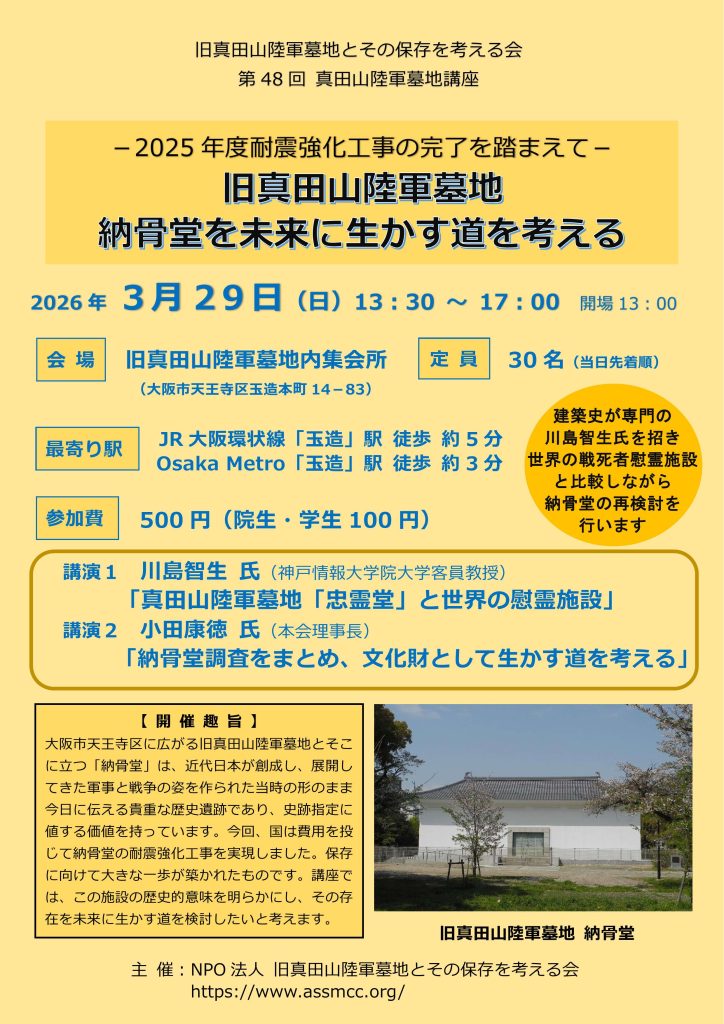 大阪市天王寺区に広がる旧真田山陸軍墓地とそこに立つ「納骨堂」は、近代日本が創成し、展開してきた軍事と戦争の姿を作られた当時の形のまま今日に伝える貴重な歴史遺跡であり、史跡指定に値する価値を持っています。今回、国は費用を投じて納骨堂の耐震強化工事を実現しました。保存に向けて大きな一歩が築かれたものです。講座では、この施設の歴史的意味を明らかにし、その存在を未来に生かす道を検討したいと考えます。