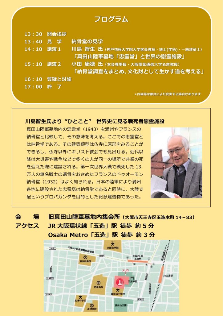 2025 年2 月中には、大阪旧真田山陸軍墓地内にある納骨堂の耐震強化工事が完成する。つづいて仮保管している骨壷等の復元配置作業も始まる。時あたかも、2025 年は日本の敗戦後80 年目に当たる年でもある。納骨堂が戦時下に建築された時、それは戦没者の慰霊・追悼さらには国民の戦意高揚を担うものとされた。今、それを過去の戦争と軍隊のありようを記憶、反省し平和への目印となる史跡、文化財として位置付けることは可能か。基本知識を整理しながら広範な市民の皆さんとともに検討していきたい。